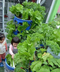 Tháp rau hữu cơ phiên bản 1 – MÙA THU HOẠCH RAU – làm bằng thùng phuy nhựa, đường kính 60 cm.